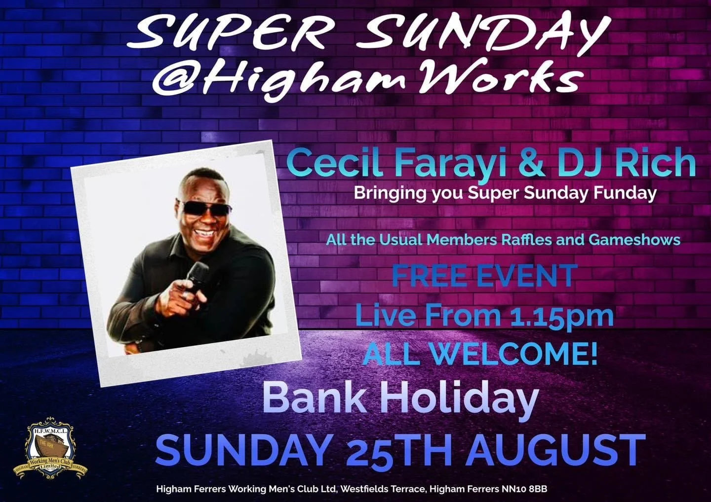 Super Sunday Funday Entertainment! Sunday 25 August 2024 13:15 16:15 Higham Works WMC 6-8 Westfields Terrace Rushden, England, NN10 8BB United Kingdom (map) Google Calendar ICS